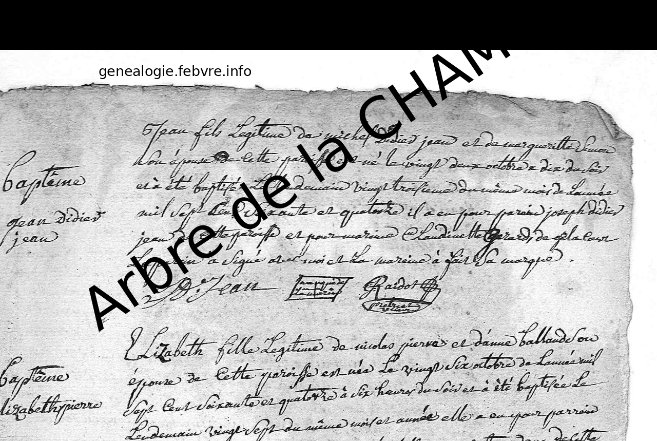 Elisabeth THIEBAULT Naissance : 11 novembre 1714 — Doncières 88 Décès : 1783 — Nossoncourt 88700 Vosges Lorraine France |